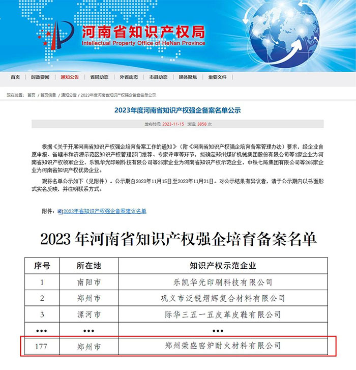 近日,河南省知識(shí)產(chǎn)權(quán)局公布2023年度河南省知識(shí)產(chǎn)權(quán)強(qiáng)企備案名單,鄭州榮盛窯爐耐火材料有限公司(以下簡(jiǎn)稱(chēng)「榮盛耐材」)榮獲「知識(shí)產(chǎn)權(quán)優(yōu)勢(shì)企業(yè)」稱(chēng)號(hào),知識(shí)產(chǎn)權(quán)綜合實(shí)力獲官方認(rèn)可。這是今年以來(lái),榮盛耐材在知識(shí)產(chǎn)權(quán)領(lǐng)域獲得的又一項(xiàng)榮譽(yù)。