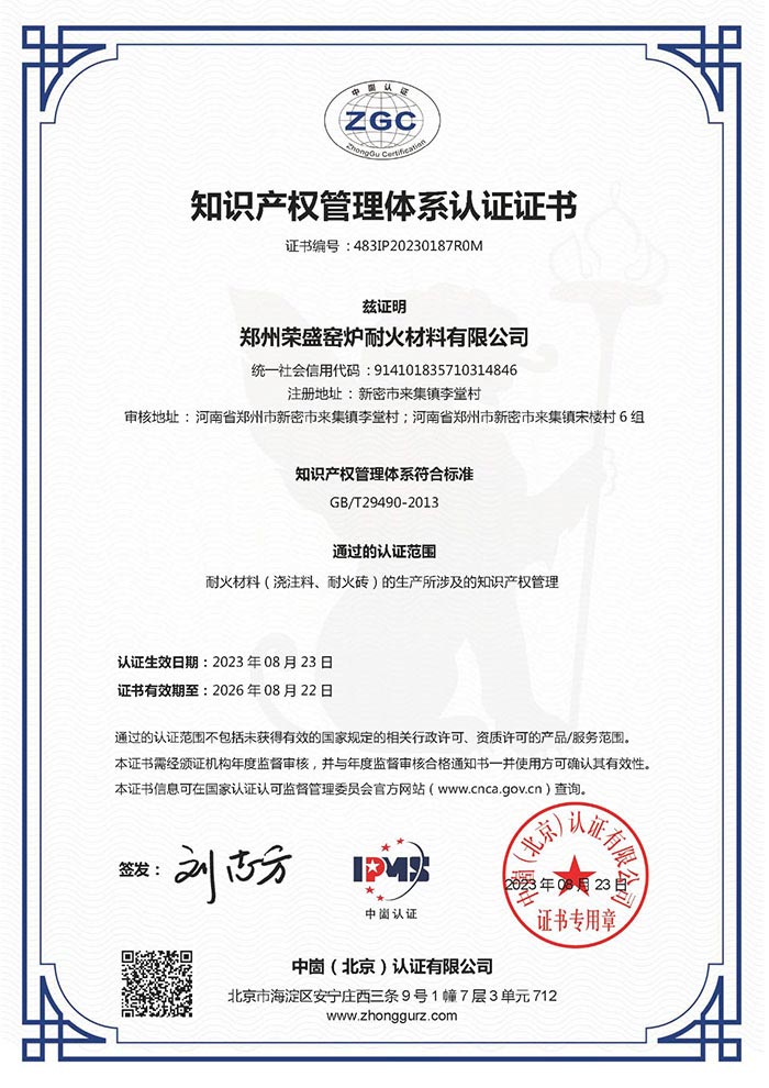 近日,鄭州榮盛窯爐耐火材料有限公司(以下簡(jiǎn)稱(chēng)「榮盛耐材」)順利通過(guò)知識(shí)產(chǎn)權(quán)貫標(biāo),并獲得了《知識(shí)產(chǎn)權(quán)管理》中英文雙語(yǔ)。該項(xiàng)的順利通過(guò),標(biāo)志著榮盛耐材構(gòu)建了一套規(guī)范化、系統(tǒng)化、程序化、精細(xì)化的知識(shí)產(chǎn)權(quán)管理。
