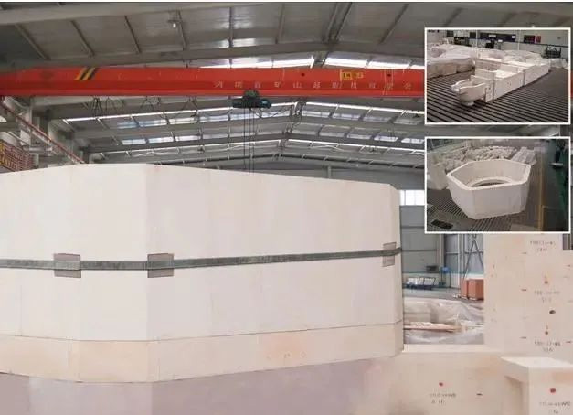 其產(chǎn)品優(yōu)點(diǎn)為:①使用了電熔氧化硅結(jié)合相,不含氧化鈣成分,二氧化硅含量可達(dá)98.5%以上;②密度更小(1.8g/cm3),降低了整個(gè)大碹的重量;③價(jià)格相比同級(jí)別電熔材料更低;④比硅磚具有更低的膨脹系數(shù)(650℃時(shí)0.6%)、更高的使用溫度(T0.5為1690℃);⑤更好的體積穩(wěn)定性。在國(guó)內(nèi)某全氧燃燒窯爐上有使用經(jīng)歷,但大碹出現(xiàn)威脅到窯爐的變形問(wèn)題。
