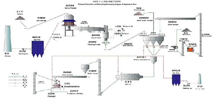 金屬鎂生產(chǎn)工藝-旋轉(zhuǎn)窯煅造白云石生產(chǎn)工藝:抓斗起重機將白云石送往皮帶運輸機,根據(jù)震動篩選出合格的金屬鎂,由大傾角帶送往預(yù)熱器頂端料倉。料倉里的白云石根據(jù)六根滑管進到預(yù)熱器,煅造中產(chǎn)生的約900℃熱煙氣與白云石在此傳熱。當(dāng)白云石被加熱到800℃時,液壓推桿將石塊送至回轉(zhuǎn)窯尾端鍛練。鎂回轉(zhuǎn)窯的旋轉(zhuǎn)使石白云石受熱均勻,并逐步向窯頭方向移動。窯頭罩處安裝燒嘴,點燃溫度做到1250℃,以適應(yīng)活力煅白對溫度的需求。熱煅燒白從窯頭掉入冷卻塔,與風(fēng)機鼓入的二次空氣傳熱。氣體加熱至600℃左右,進到窯頭點燃,煅燒白冷卻至100℃以下,依據(jù)給料機對稱掉入鱗板輸送機,輸送至下一道工序。離去預(yù)熱器約260℃的廢氣,通過管道進到布袋除塵器,凈化廢氣,完成標(biāo)準(zhǔn)排出,進行煅造金屬鎂的整個生產(chǎn)過程。