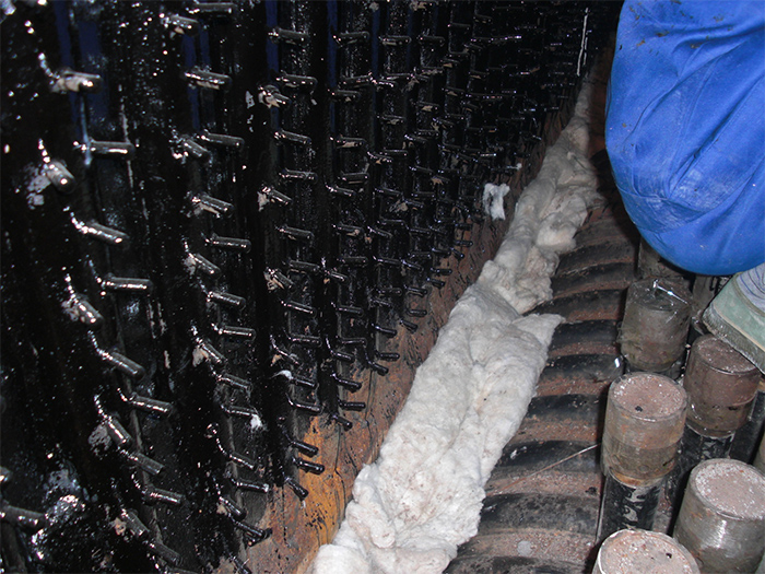 因金屬材料與耐磨材料受熱后線脹系數(shù)的差異,在耐磨耐火材料施工前,必需在金屬材料( 包括銷釘, 托板及管子) 表面涂瀝青, 涂刷瀝清是在澆注料與受熱面之間留有一定的間隙, 運(yùn)行時受熱面熱膨脹差不會對耐磨材料造成破壞。