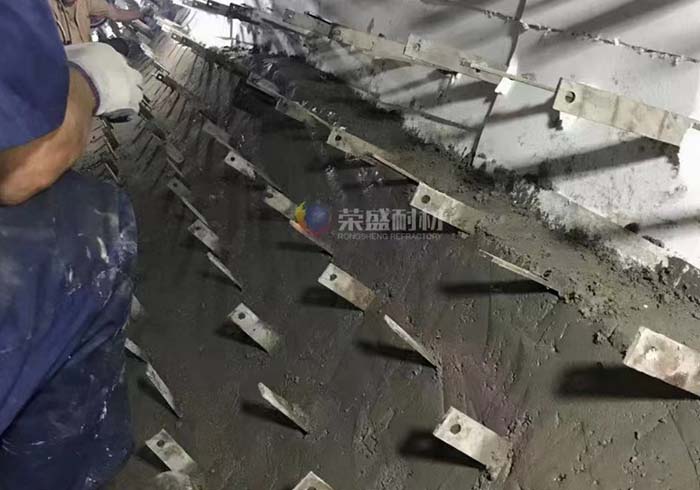高溫段因需要考慮耐火以及耐磨等因素則采用重質(zhì)澆注料加輕質(zhì)澆注料相結(jié)合的復(fù)合結(jié)構(gòu),鏈篦機爐頂和高溫段側(cè)墻一般采用錨固磚結(jié)合澆注料的形式,但在高溫段側(cè)墻水平方向上需鋪設(shè)一條托板,這樣做的好處是人為設(shè)置一條膨脹縫,可以較大程度地消除因為膨脹對錨固磚產(chǎn)生的破壞作用。