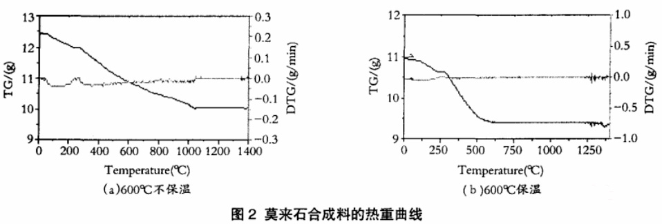 由于DSC-TG分析的測量用料量大多≤100mg,并且要磨成細(xì)粉。這種實驗方法很難代表混合料實際的情況,且缺乏均勻性和代表性,從動力學(xué)上也不能反映澆注料加熱過程的實阮變化情況。目前對于尺寸和質(zhì)量大的試樣,只能通過試樣加熱前后質(zhì)量的變化來表征總的反應(yīng)情況。用整體的樣塊大試樣加熱更接近真實。大試樣熱重儀對烘干后的試樣進(jìn)行熱重分析,測定室溫至1400℃過程中重量的變化,結(jié)果如圖2(a)所示。由圖可知,在連續(xù)加熱不保溫的情況下,質(zhì)量一直到1100℃才保持穩(wěn)定。根據(jù)DSC-TG及大試樣熱重分析結(jié)果,混合料在1200℃以上均可生成莫來石,只是莫來石的生成速度和轉(zhuǎn)化率隨溫度不同而會有所差異。本工作的主要目的是合成具有微孔結(jié)構(gòu)的莫來石骨料,既要求合成料有一定的氣孔率,孔徑小、體密輕,又要求其強度高,即要有理想的莫來石轉(zhuǎn)化率,同時還要兼顧煅燒設(shè)備投資、生產(chǎn)成本等,因此摸索理想熱處理制度對本工作而言至關(guān)重要。