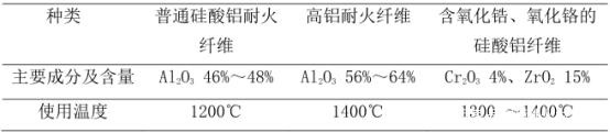 硅酸鋁耐火纖維又稱(chēng)為陶瓷纖維,其主要組成是SiO2、Al2O3、Fe2O3、K2O、Na2O等,其中SiO2和Al2O3占95%以上,F(xiàn)e2O3約占0.98%,K2O和Na2O約占0.5%。硅酸鋁纖維的表面光滑,內(nèi)部固相物質(zhì)以連續(xù)骨架形式存在,配合間隙中的低熱導(dǎo)率空氣,起到了保溫效果。生產(chǎn)硅酸鋁耐火纖維的方法是將精選的焦寶石原料在2000℃以上的電爐里融化,再采用噴吹或離心等方法使之纖維化。硅酸鋁耐火纖維按照其成分和使用溫度可以分為3類(lèi),如表2所示: